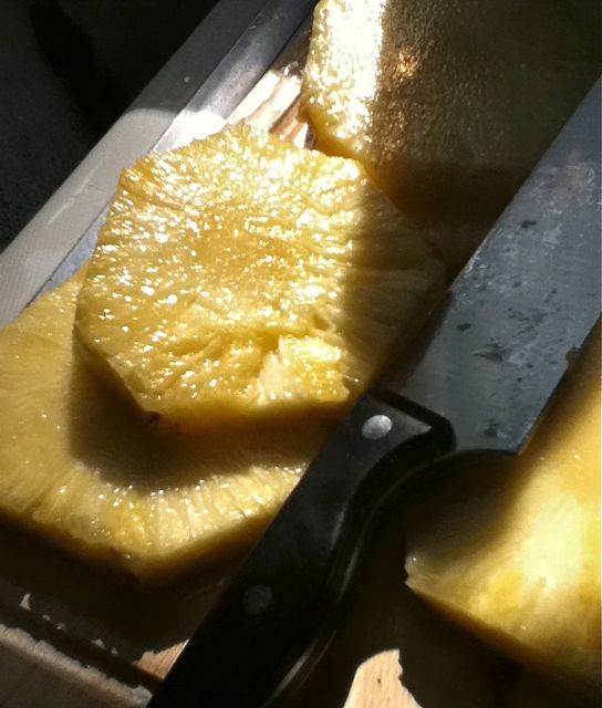 What I really want to show you is how I cut up a pineapple. It is really easy and a cheap fruit to buy when in season, which is right now, April & May but can be March through July.